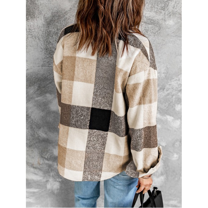 Khaki Plaid Color Block Buttoned Long Sleeve Jacket with Pocket
