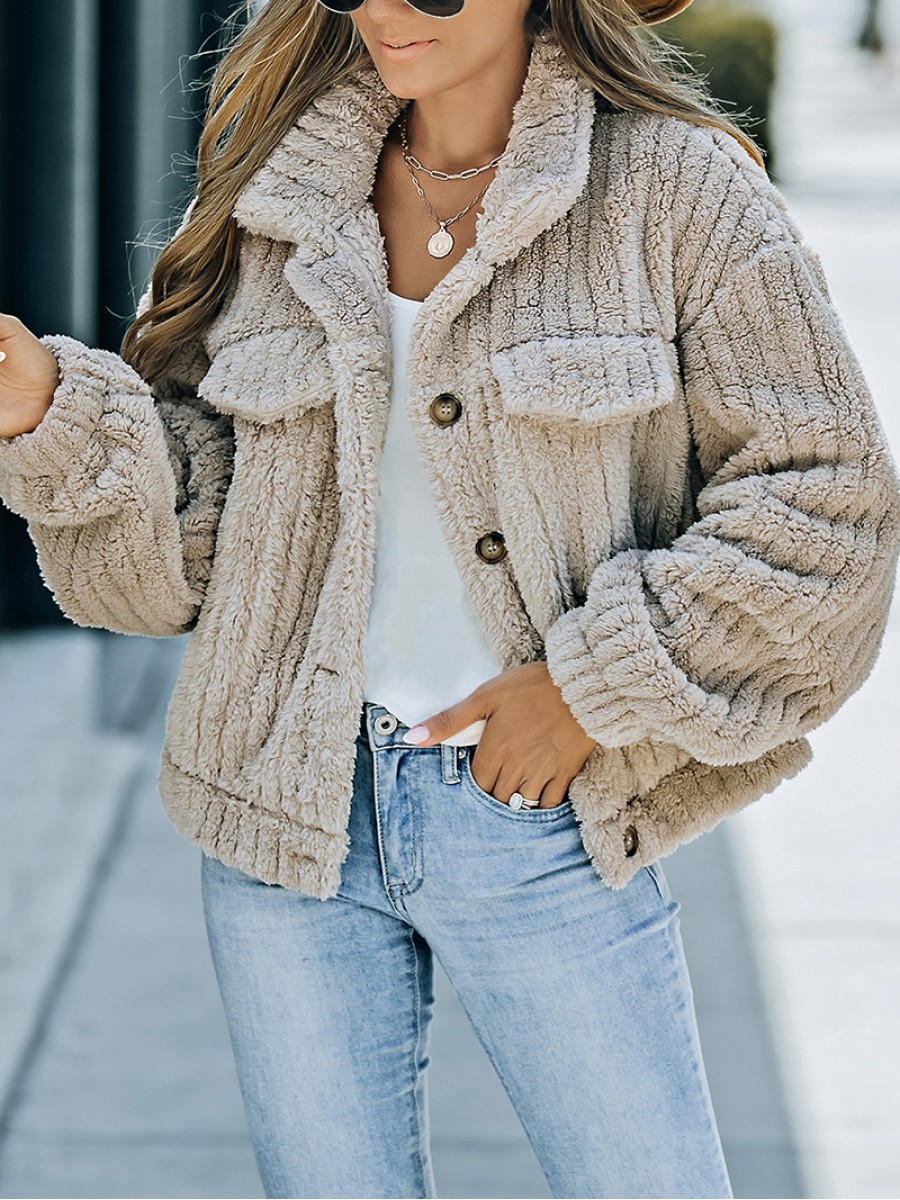 • Product Code: khaki-solid-color-plush-fleece-button-up-jacket-11946