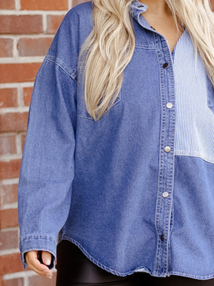 Spliced striped fabric pocket denim shirt